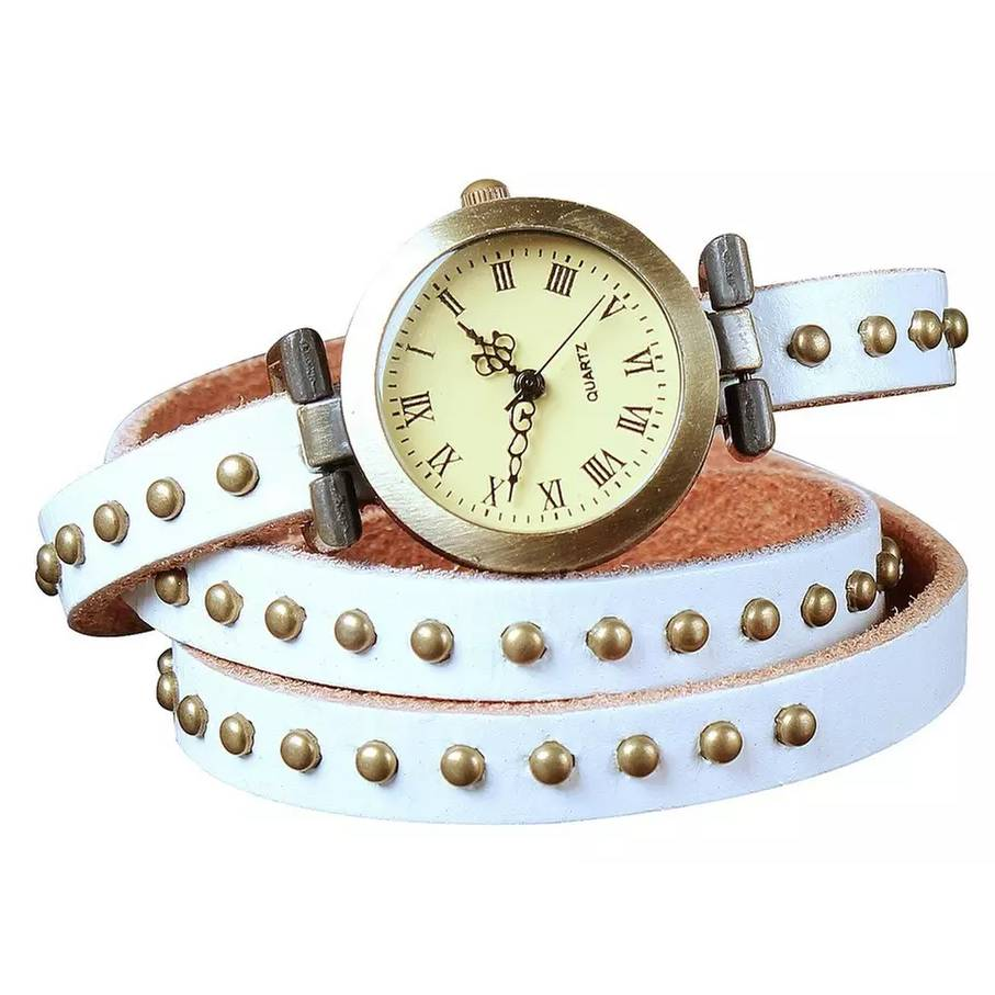 This coil watch features beautiful rivet accents and comes in a wide array of colors. Just wrap it around your wrist for a unique and stylish look.