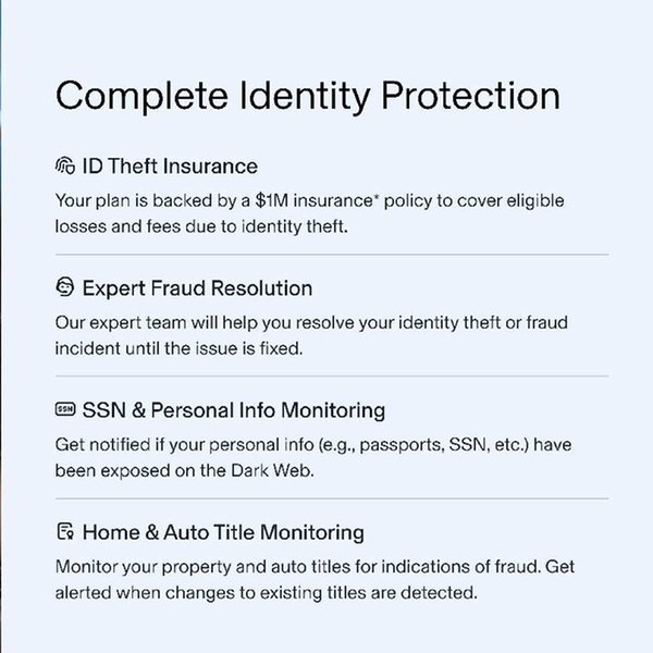 - $1,000,000 ID Theft Coverage: Covers eligible losses including legal fees, stolen funds, and lost wages.
