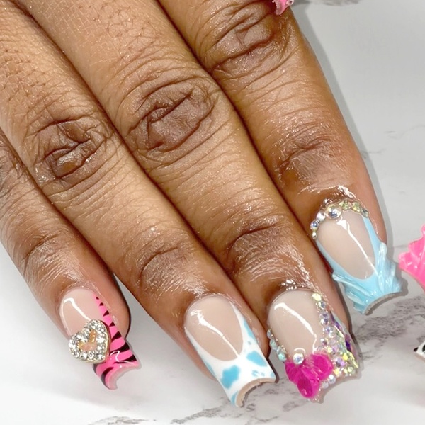 - GEL X Long/XL square/coffin 1 design on 1 finger per hand: Unique styling with a bold design choice per hand.,