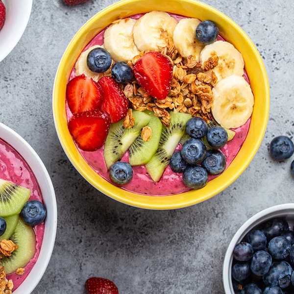 Enjoy an organic brunch bowl with honey almond granola, fresh fruits & cacao nibs for a refreshing start to your day