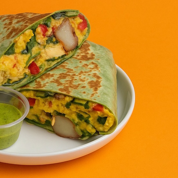 Breakfast Burrito A hearty burrito filled with scrambled eggs, cheddar cheese, and our signature Benedict’s sauce, all wrapped in a vibrant green tortilla. Served with crispy potatoes and your choice of meat or fresh vegetables.