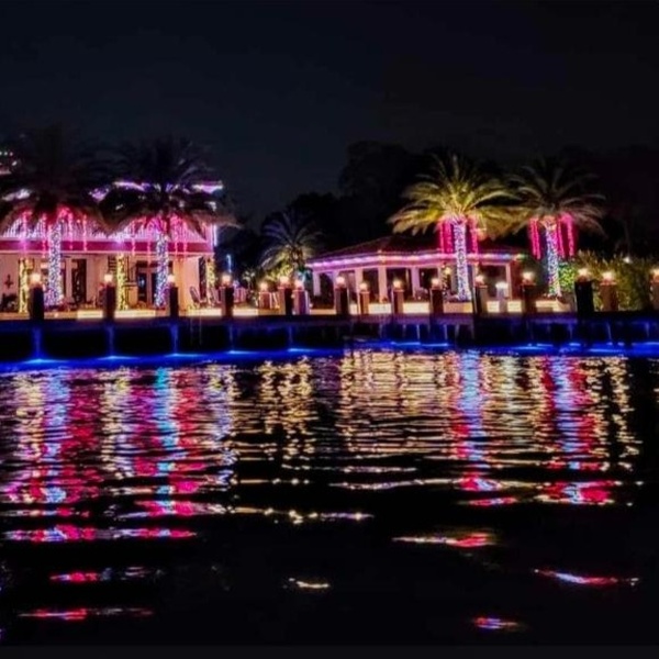 Witness mesmerizing holiday lights illuminating luxurious mansions and elegant yachts along the waterfront.