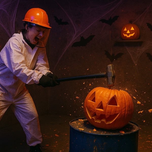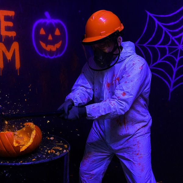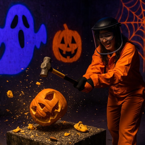 Description: Guests suit up and enter the rage room armed with bats, sledgehammers, and crowbars to destroy real pumpkins alongside standard rage room breakables.