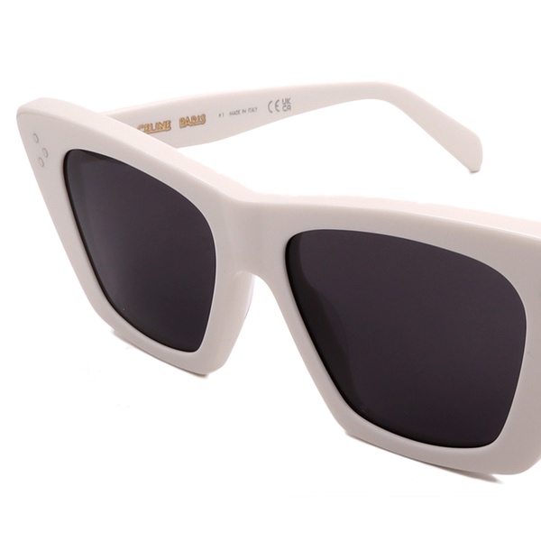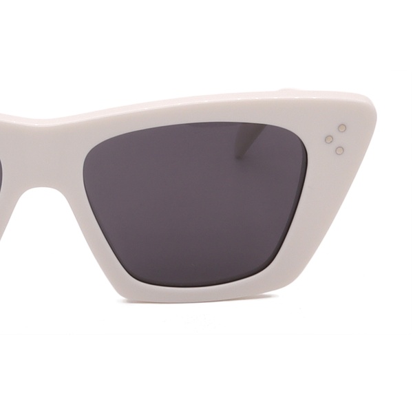 Option 1 CL40187I 25A — Black — 51-16-145 — Grey These sunglasses are a bold expression of modern elegance, featuring a thick, sculptured white acetate in a distinct cat-eye shape. The contrast with the dark grey lenses and the signature triple-dot pin hardware makes them a striking statement of quiet luxury.