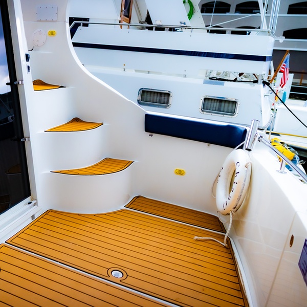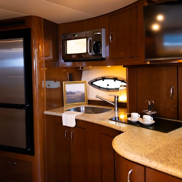 This yacht is in excellent condition. Inside, you’ll find soft white leather seating, oak wood accents, and subtle Italian and French-inspired touches that give it a warm, refined feel.