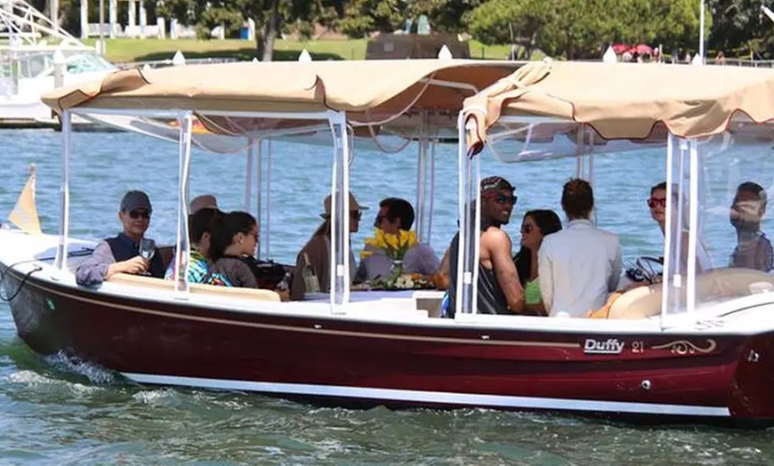 Embark on a tranquil and eco-friendly electric Duffy boat cruise in Newport Harbor, perfect for creating cherished memories with loved ones amidst stunning sunset views and luxurious scenery.