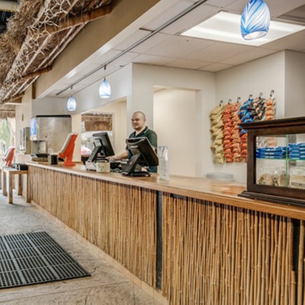 - Grab a coffee or pizza at the resort’s food court or cafés.