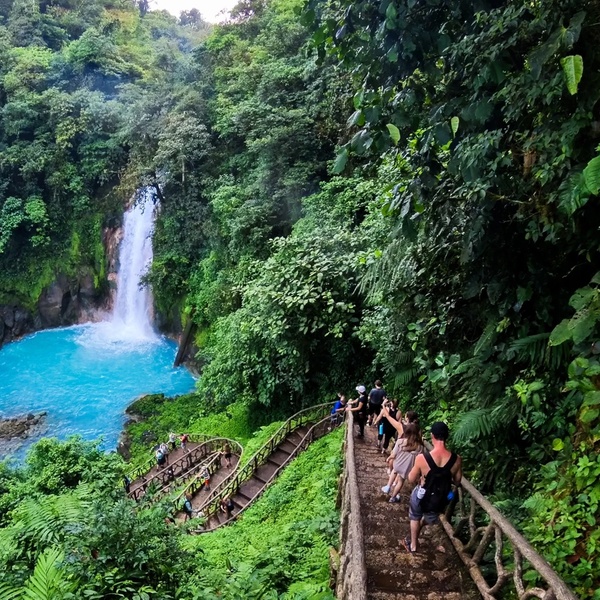 On the sixth day, you'll take a full-day trip to Río Celeste. It's an incredible place, and you'll enjoy it to the fullest. In the morning, you'll go to the meeting point to meet your guide. There, you'll take a dip at the magical Llanos de Cortez waterfall, then visit an ecological farm with sloths and frogs, walk through a beautiful park to the Rio Celeste waterfall, and have a real Costa Rican lunch. In the evening, you can relax in the thermal river or go out for fun in La Fortuna.