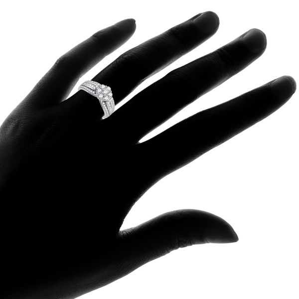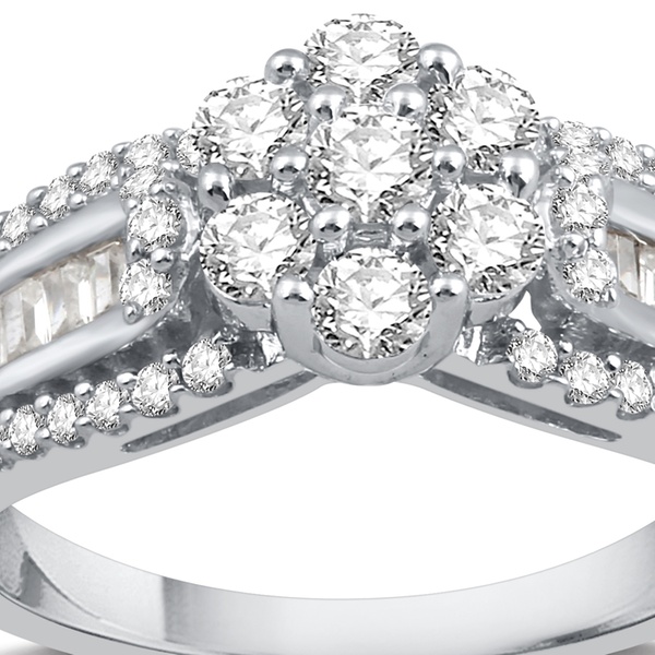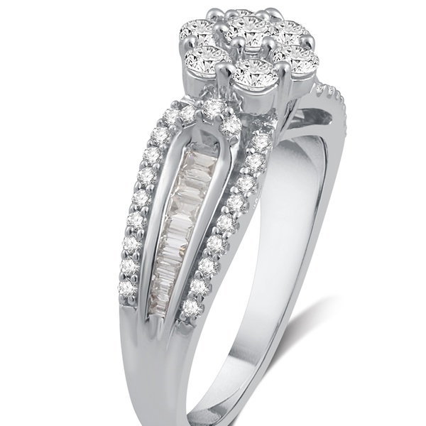 A cluster of diamonds draws attention to this sterling silver engagement ring featuring a band adorned with round- and baguette cut stones