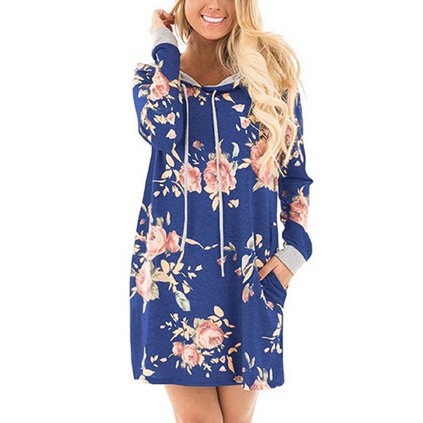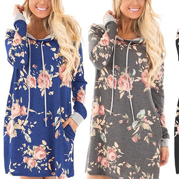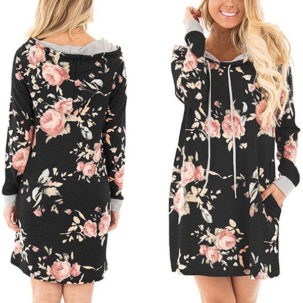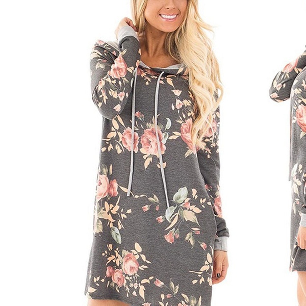 This comfortable hoodie dress features a unique floral pattern and is great for lounging around the house