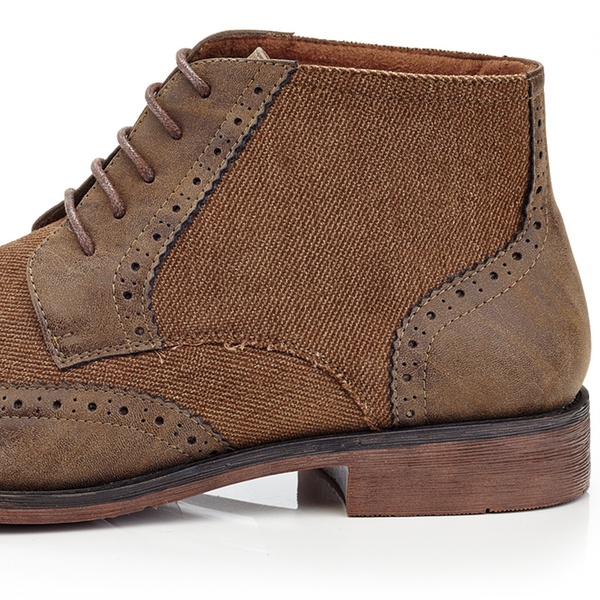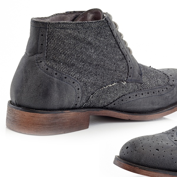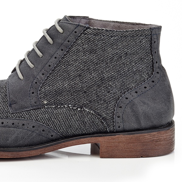 These wing tip oxford boots with a denim design can be paired nicely with both a casual, as well as with a more elegant outfit