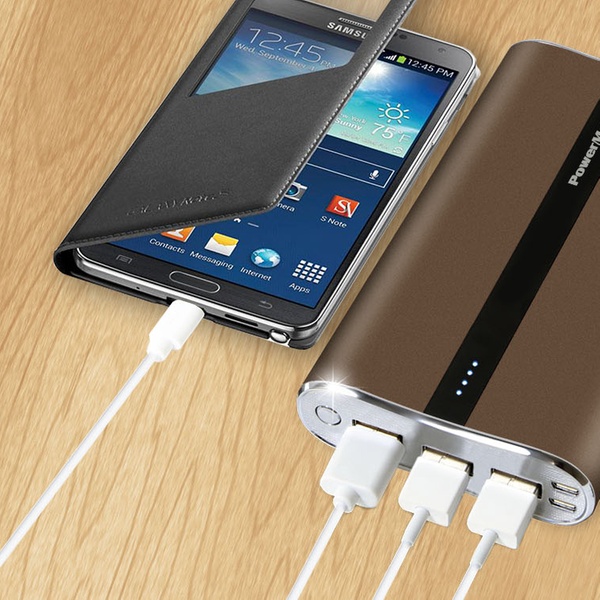 Power bank with 20,000nAh battery capacity features 3 USB outputs and 2 micro USB input ports to provide the fastest recharging speed