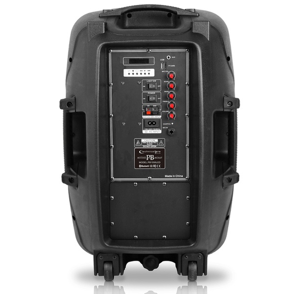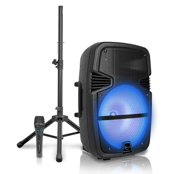 Party-themed paraphernalia set with a microphone and 12” or 15” LED woofer featuring Bluetooth connectivity to get your party started
