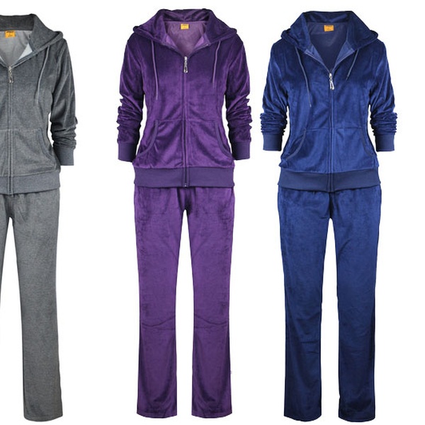 2-piece tracksuit features a zip-up sweater with hood and kangaroo pockets and comfortable pants with two back pockets