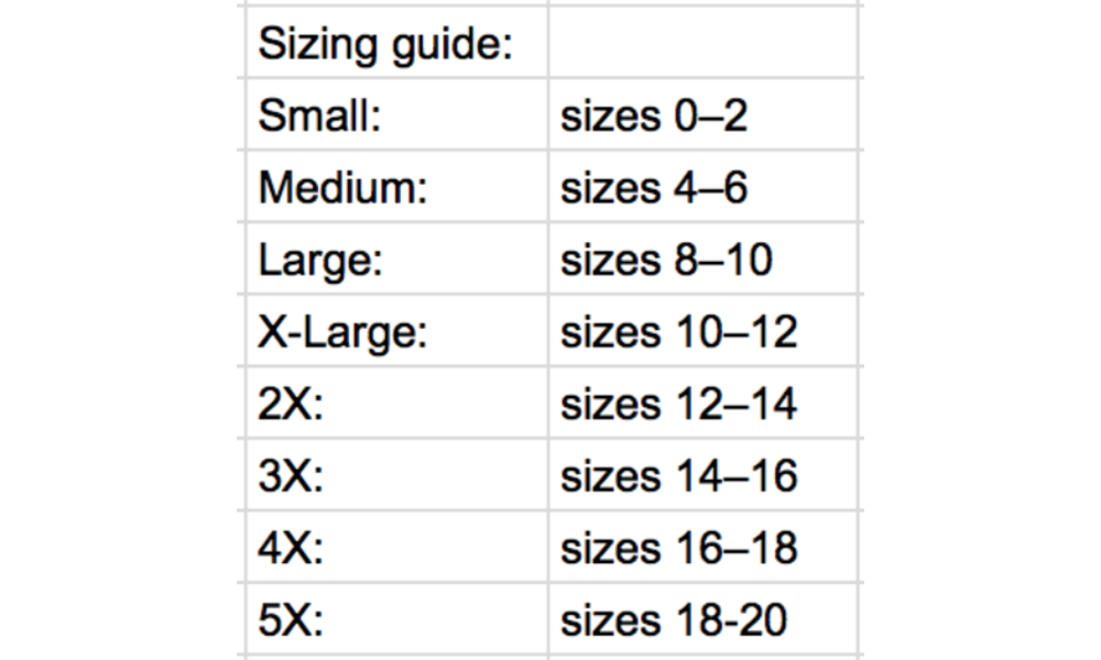 - Sizing chart