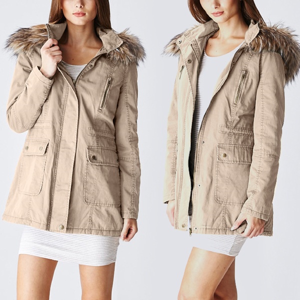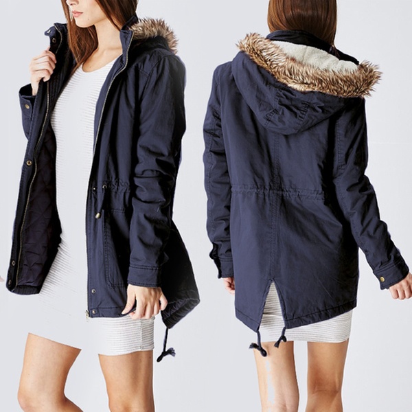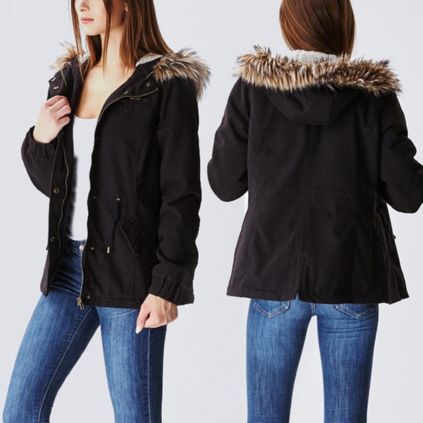 - Hood lined with faux fur