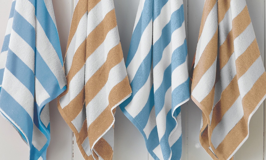 Classic cabana stripe style and modern, vibrant colors are the features that make these beach towels fun for summer. Available in a four-pack, you'll have the perfect set for the poolside or beach trip. These towels are soft to the touch and made of durable cotton that makes them absorbent and quick-drying, and they'll get softer with each spin in the washer and dryer. So enjoy your summer days relaxing on soft and stylish beach towels.