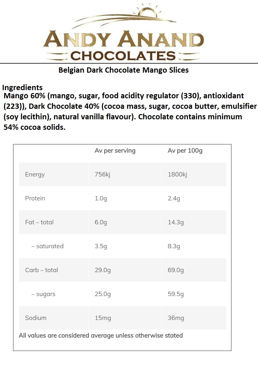 * Delicious Mango Slices half enrobed by Belgian Dark Chocolate with Amazing Taste, Promises a very indulgent experience. Mangoes are sliced, dried and covered in premium Belgian Chocolate. Perfect anytime snack. The sweet temptations of chocolate-covered snacks are very hard to resist.Taste in every Bite, handmade in small batches, to create that unique taste not found in any mass produced Chocolates.