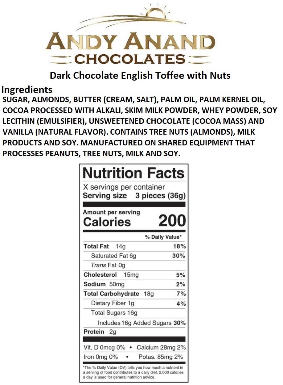 Grandmother’s Old Fashioned English Toffee sparkled with California Almonds Dark Belgian chocolate! Same way my Grandmother used to make Delicious with Amazing Taste Sugar & real butter are lovingly married and blended until it reaches a precise temperature when the signature caramel is rich and luscious. We then add lightly toasted almonds as it cools on marble slabs and drench it in a generous layer of rich Dark chocolate perfect complement to the snap of the buttery toffee and salty almonds