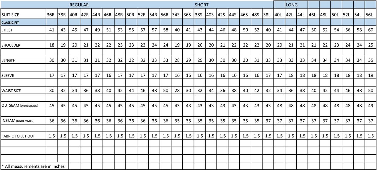 The classic fit is a roomier, true-to-size cut in the chest and body. The number in the size refers to your chest measurement. Measure chest under arms and across your shoulder blades, keeping the tape level. If your measurement is 38”, you would wear a size 38. Waist size is a standard 6” drop from the jacket, subtract 6 to find the waist size. For example, a 38” jacket comes with 32” waist pants. Lengths come in “Short, Regular, and Long.”