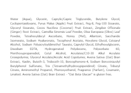 • Skincare Directions for Use: Water (Aqua), Glycerin, Caprylic/Capric Triglyceride, Butylene Glycol, Cyclopentasiloxane, Pyrus Malus (Apple) Fruit Extract, Peg-8, Peg-100 Stearate, Glyceryl Stearate, Cocos Nucifera (Coconut) Fruit Extract, Zingiber Officinale (Ginger) Root Extract, Camellia Sinensis Leaf Powder, Olea Europaea (Olive) Leaf Powder, Tetrahexyldecyl Ascorbate, Honey (Mel), Allantoin, Saccharide Isomerate, Sodium Hyaluronate, Tocopheryl Acetate, Hexylene Glycol, Cetearyl Alcohol, Sodium Polyacryloyldimethyl Taurate, Caprylyl Glycol, Ethylhexylglycerin, Disodium EDTA, Hydrogenated Polydecene, Polysorbate 60, Menthoxypropanediol, Cetyl Alcohol, Acrylates/C10-30 Alkyl Acrylate Crosspolymer, Glyceryl Acrylate/Acrylic Acid Copolymer, Avena Sativa (Oat) Bran Extract, Kaolin, Buteth-3, Trideceth-10, Benzophenone-4, Sodium Benzotriazolyl Butylphenol Sulfonate, Tris (Tetramethylhydroxypiperidinol) Citrate, Tributyl Citrate, Aminomethyl Propanol, Phenoxyethanol, Fragrance (Parfum), Coumarin, Linalool. Avena Sativa (Oat) Bran Extract - "Oat Beta Glucan" is gluten free.