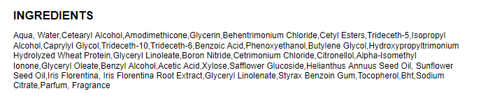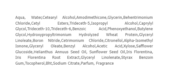 - Ingredients: Aqua, Water,Cetearyl Alcohol,Amodimethicone,Glycerin,Behentrimonium Chloride,Cetyl Esters,Trideceth-5,Isopropyl Alcohol,Caprylyl Glycol,Trideceth-10,Trideceth-6,Benzoic Acid,Phenoxyethanol,Butylene Glycol,Hydroxypropyltrimonium Hydrolyzed Wheat Protein,Glyceryl Linoleate,Boron Nitride,Cetrimonium Chloride,Citronellol,Alpha-Isomethyl Ionone,Glyceryl Oleate,Benzyl Alcohol,Acetic Acid,Xylose,Safflower Glucoside,Helianthus Annuus Seed Oil, Sunflower Seed Oil,Iris Florentina, Iris Florentina Root Extract,Glyceryl Linolenate,Styrax Benzoin Gum,Tocopherol,Bht,Sodium Citrate,Parfum, Fragrance