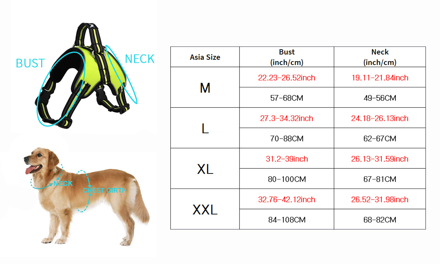 Large Size: Chest Size 27.3-34.32inch, Neck Size 24.18-26.13inch, Weight 55-85 LBS