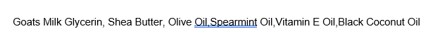 - Goats Milk Glycerin, Shea Butter, Olive Oil,Spearmint Oil,Vitamin E Oil,Black Coconut Oil