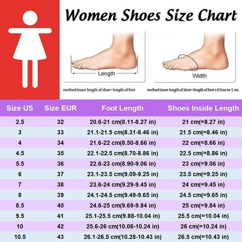 23.1~23.5cm(9.09~9.25inch)=23.5cm(=9.25inch)=US6.0=EUR37 23.6~24.0cm(9.29~9.45inch)=24.0cm(=9.45inch)=US7.0=EUR38 24.1~24.5cm(9.49~9.65inch)=24.5cm(=9.65inch)=US8.0=EUR39 24.6~25.0cm(9.69~9.84inch)=25.0cm(=9.84inch)=US8.5=EUR40