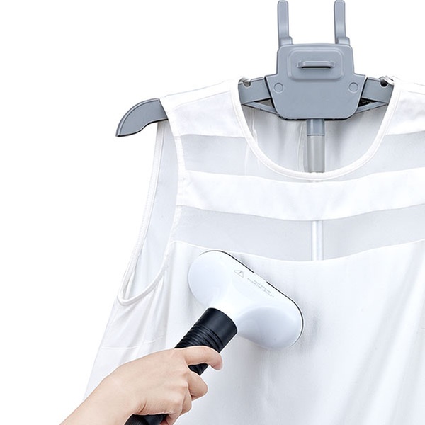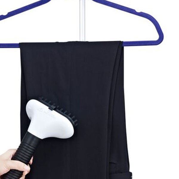 Powerful garment steamer makes it easy to remove wrinkles from clothing using continuous steam and a built-in hanger system