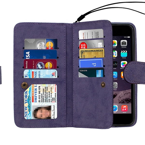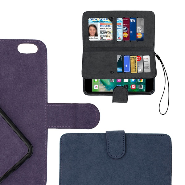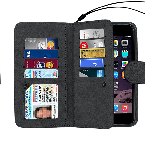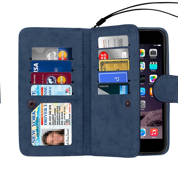 An integrated phone case that can be detached from the folio defines this 2-sided wallet that also has card and cash compartments