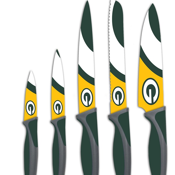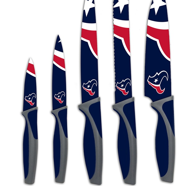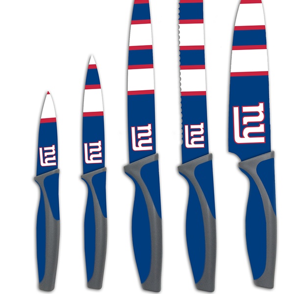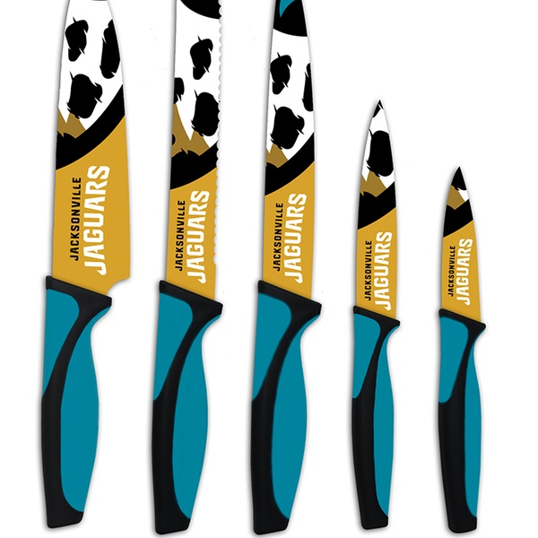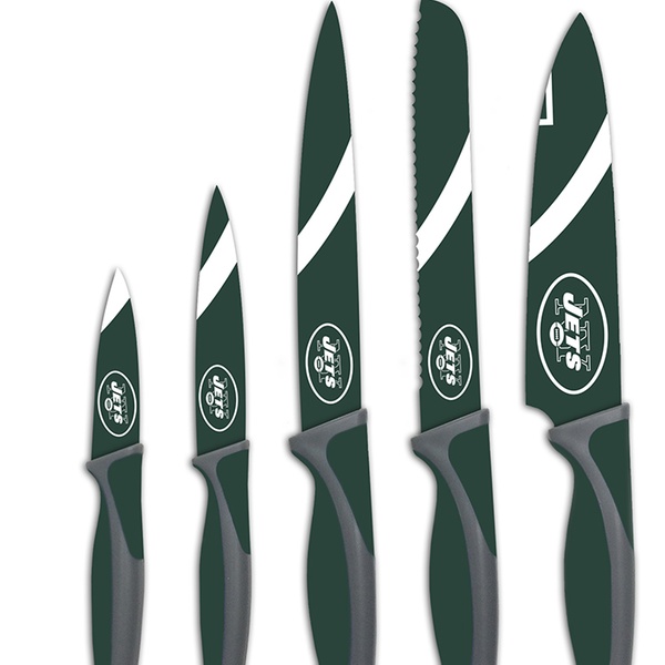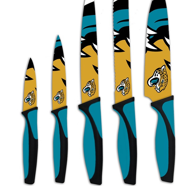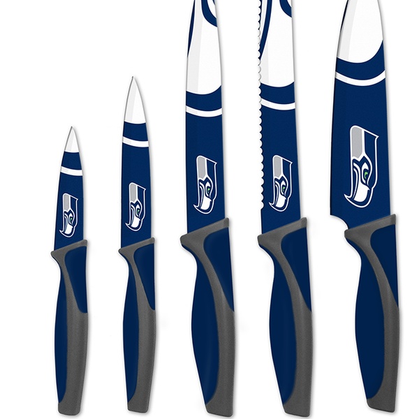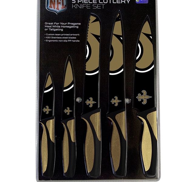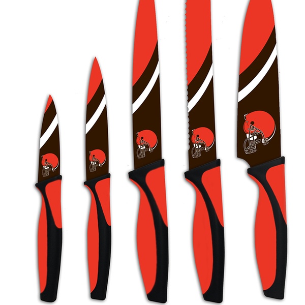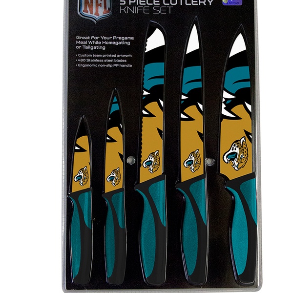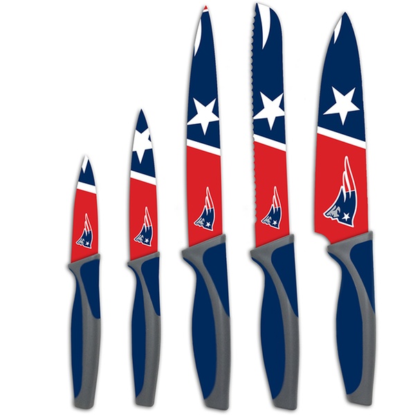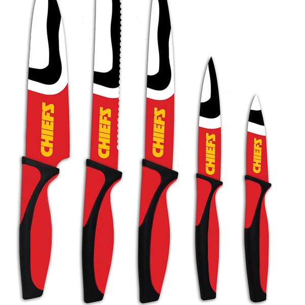Set of five kitchen knives featuring NFL imagery, non-slip ergonomic polypropylene soft-grip handles, and stainless steel blades