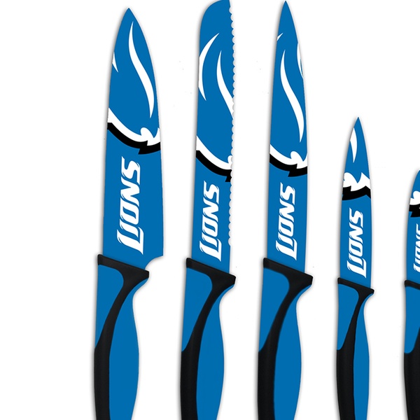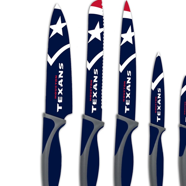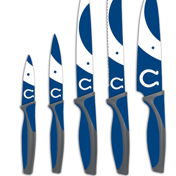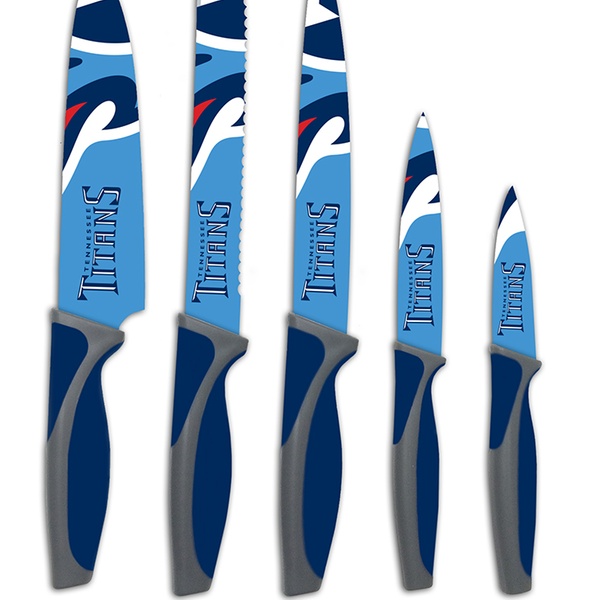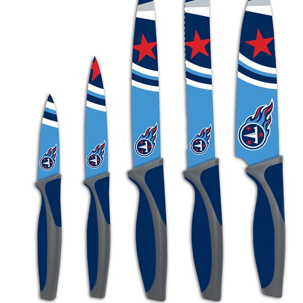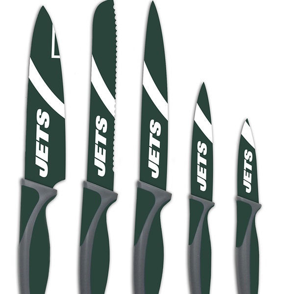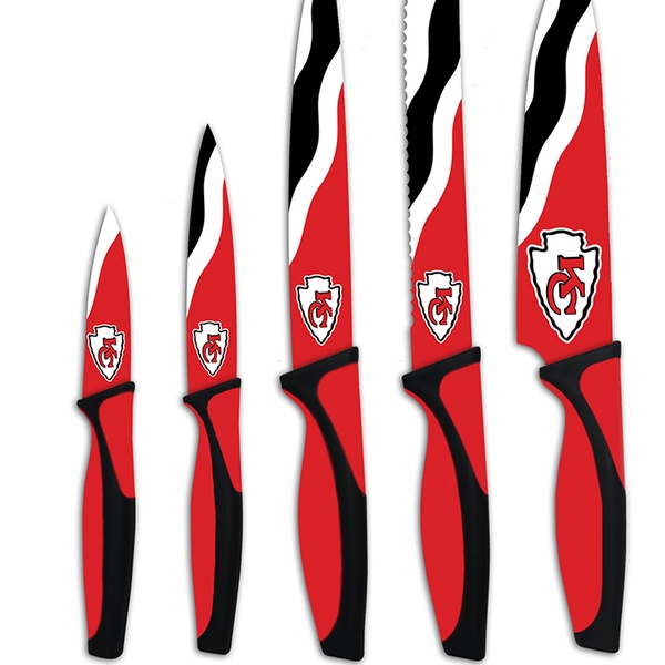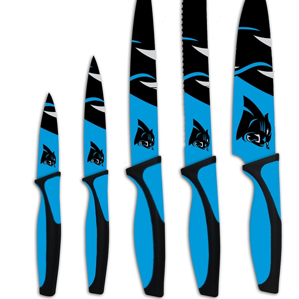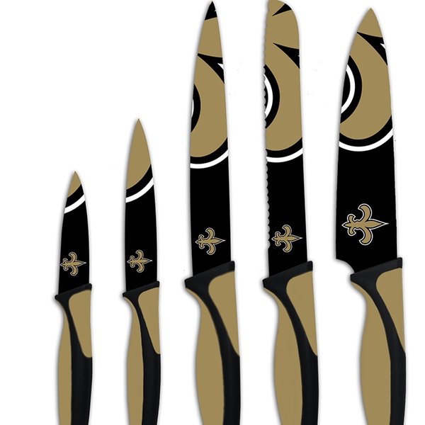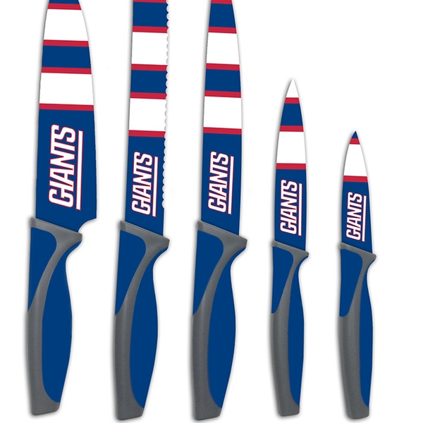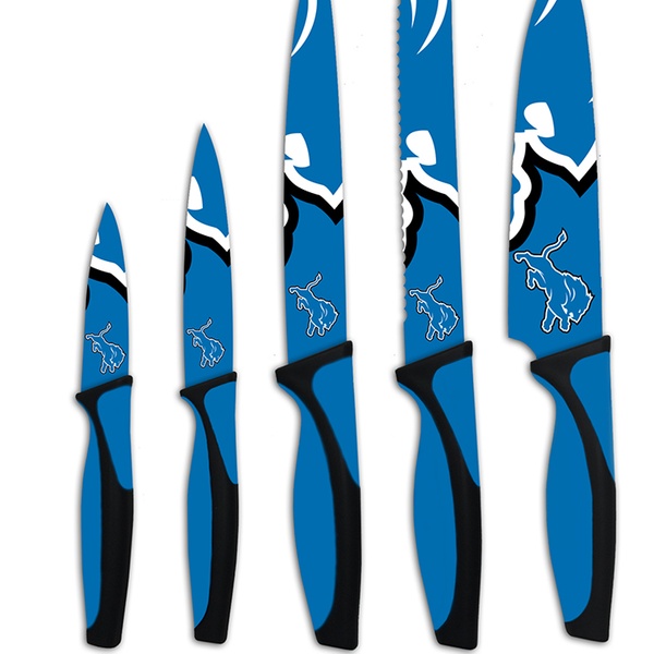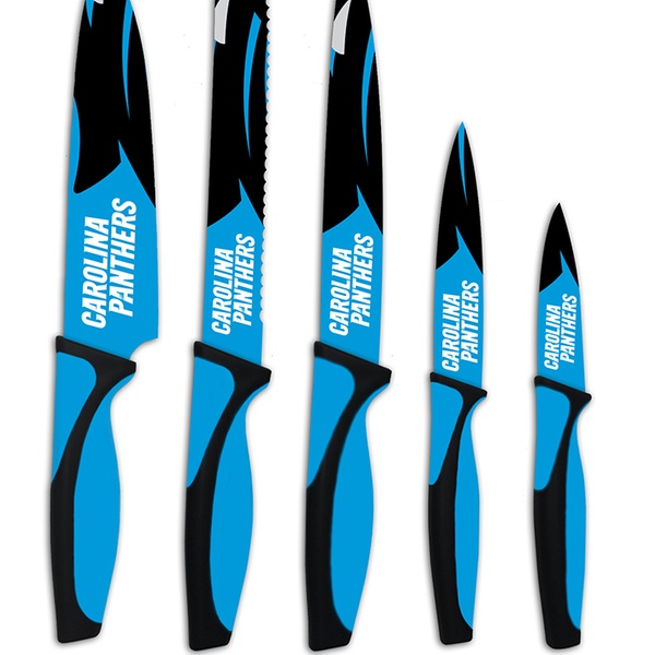 Set of five kitchen knives featuring NFL imagery, non-slip ergonomic polypropylene soft-grip handles, and stainless steel blades