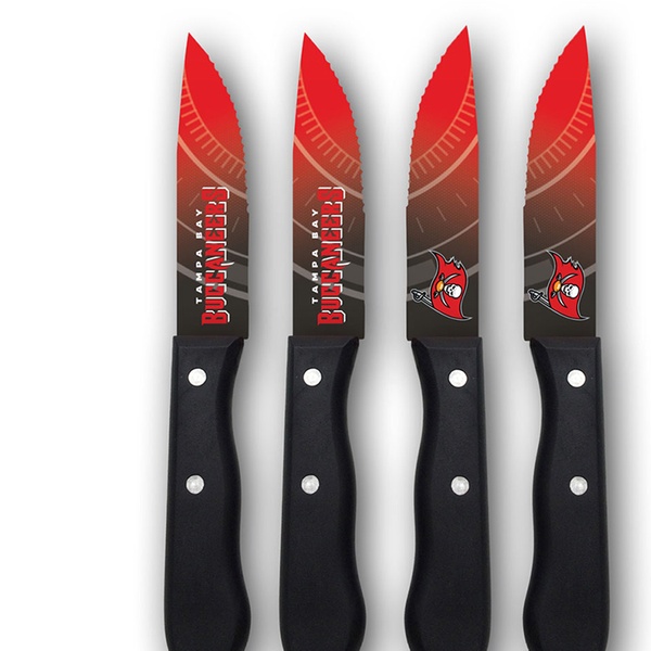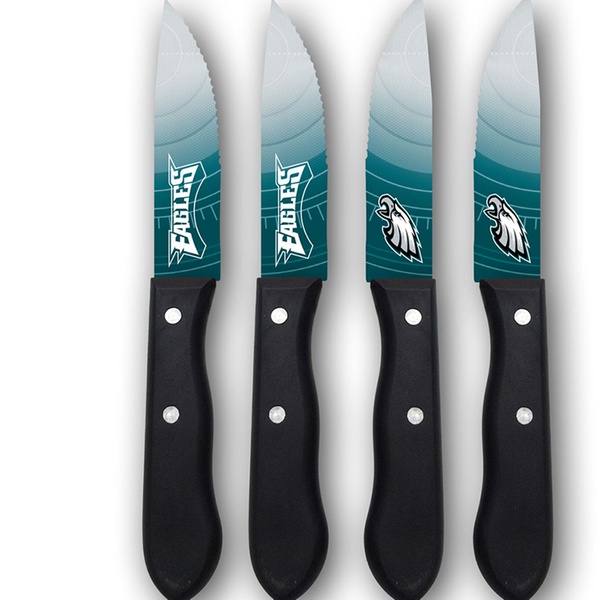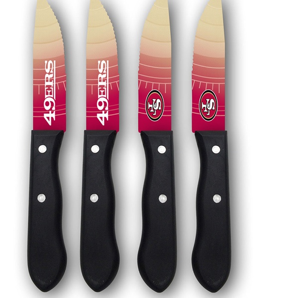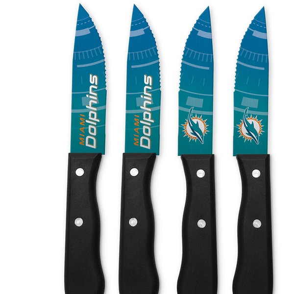This set comprises 4 knives featuring serrated blades, ergonomic handles, and team logo printed on the blades