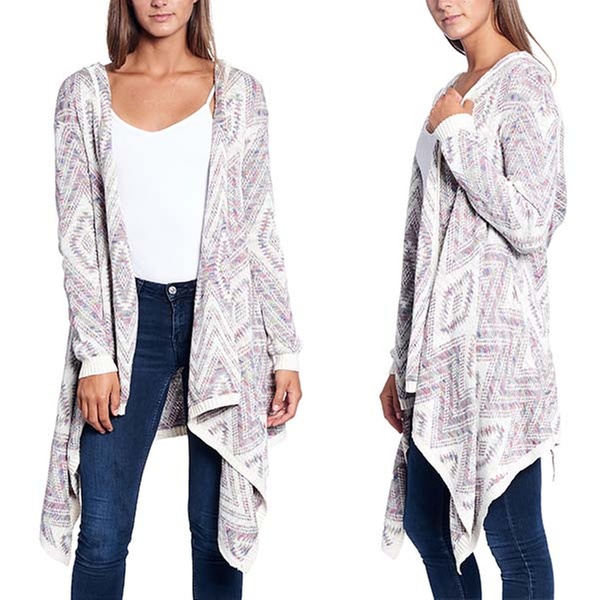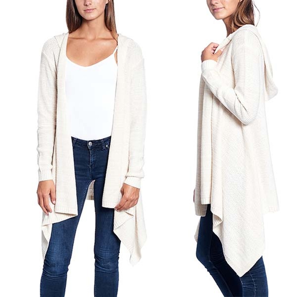 This long-sleeved, open-front cardigan features a hood and pairs well with jeans and tank tops