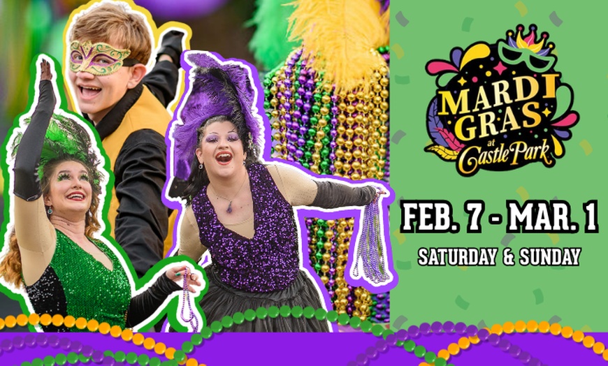 Family-Friendly Mardi Gras Celebration at Castle Park with Rides & Mini Parades