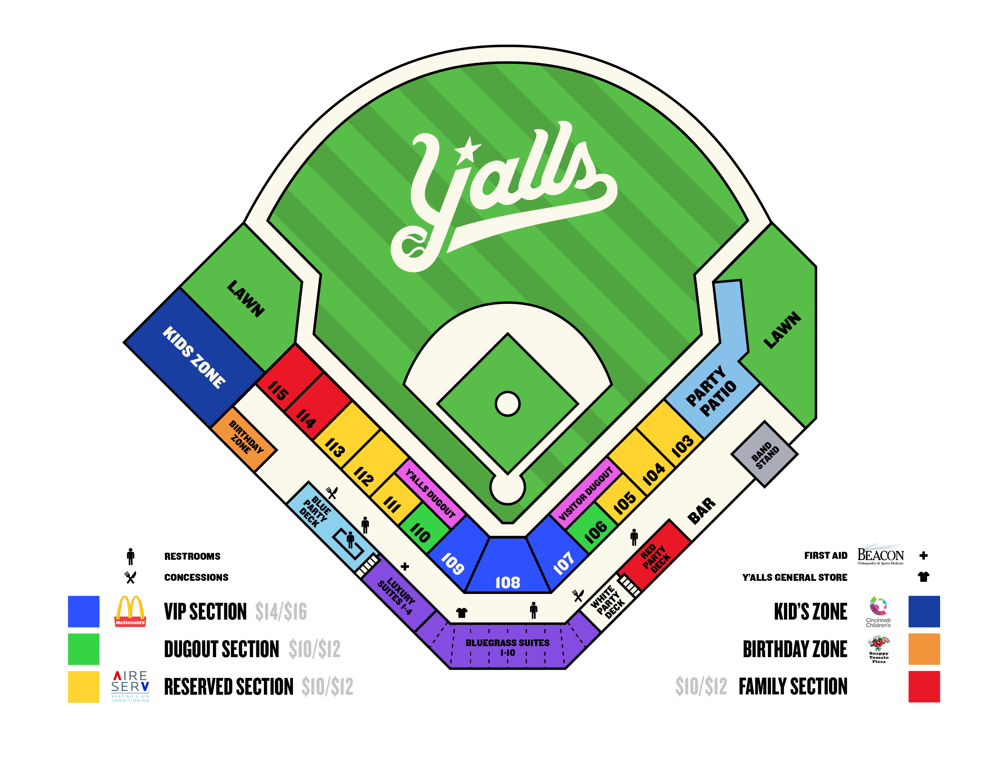 - Reserved Seats are in sections 103, 104, 105, 106, 110, 111, 112, 113, 114, and 115.