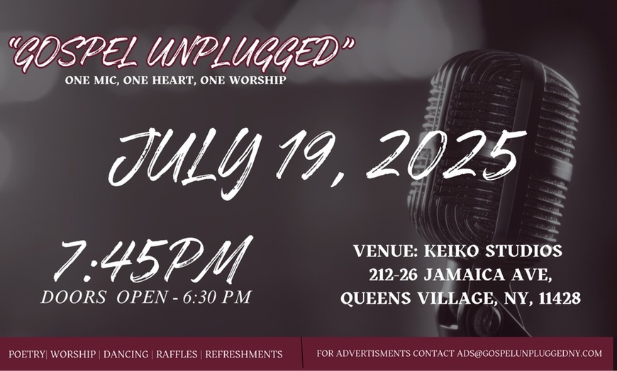 Experience an unforgettable evening of faith, creativity, and community at "Gospel Unplugged NY." This Christian open mic experience is a celebration of gospel music, poetry, storytelling, and testimonies, all performed by talented local artists. Get your tickets now! You do not want to miss it !