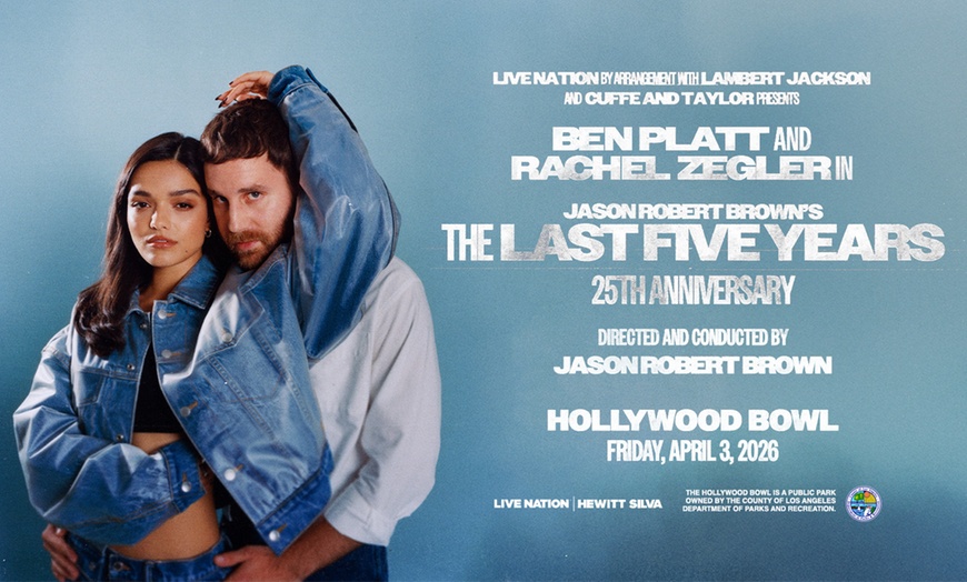 Tony, GRAMMY, and Emmy Award-winner Ben Platt (Dear Evan Hansen, Pitch Perfect, Parade) and Golden Globe and NBR winner Rachel Zegler (Evita, The Hunger Games, West Side Story), two of the most dynamic and celebrated performers of their generation, star together in a very special new concert staging of Jason Robert Brown’s The Last Five Years at the iconic Hollywood Bowl on Friday, April 3.