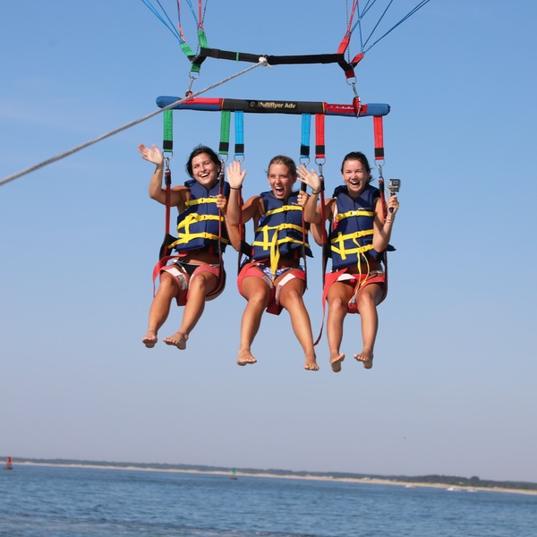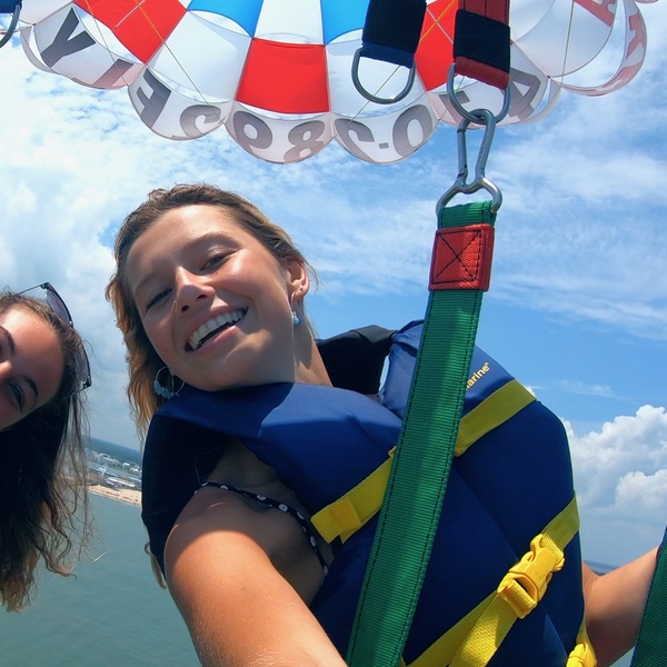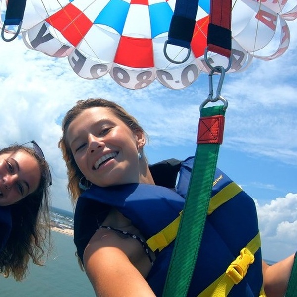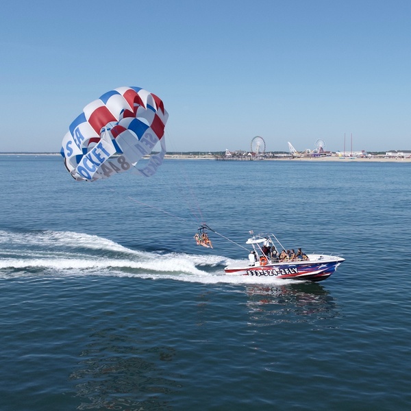 If you’re looking for a day of energy, scenic views, local wildlife, and a well-run operation, Sea Rocket delivers. Strap in, lift off, and let the Sea Rocket crew whisk you into the sky for an unforgettable parasailing adventure over Ocean City. Within minutes, you’ll be soaring up to 400 feet above the Atlantic, the shoreline stretching in both directions. With a licensed crew and caption, you'll be in safe hands for a stress-free and adrenaline filled adventure. Whether you’re flying solo, tandem, or with three in a harness, the Coast Guard–licensed crew ensures a smooth takeoff, a gentle flight, and a soft landing - often with a playful dip of your toes in the sea. It’s the perfect mix of thrill, beauty, and peace you’ll remember long after your feet are back on the deck.