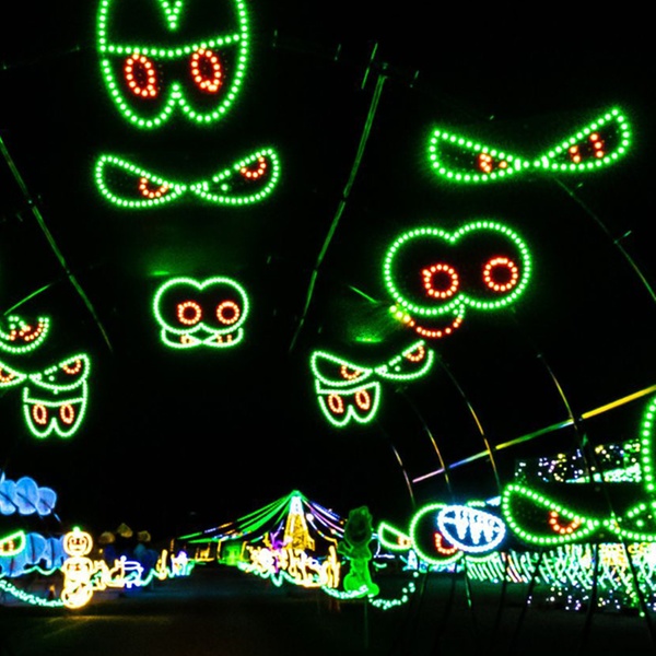 Spooky Light Show is a mile-long drive-through light display featuring Halloween-themed scenes, including giant pumpkins, ghost tunnels, and dancing skeletons, all synchronized to music. It’s an unforgettable adventure for the whole family!