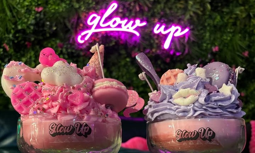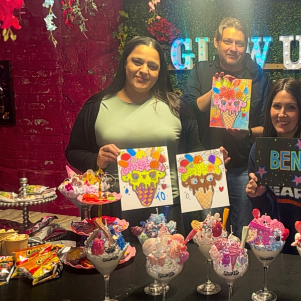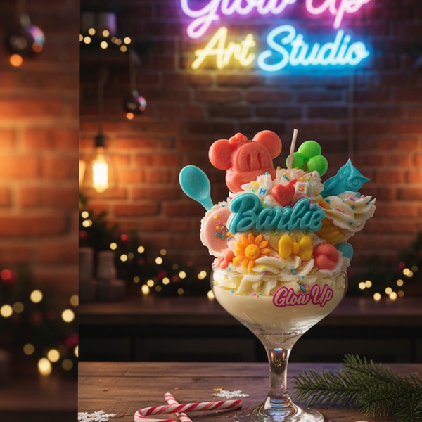 As seen on WGN Morning News! Step into Glow Up Art Studios neon speakeasy, vibe to great music, and craft a dessert candle that looks good enough to eat. Choose your base, blend yummy designer scents, add wax toppings, and take it home the same day.