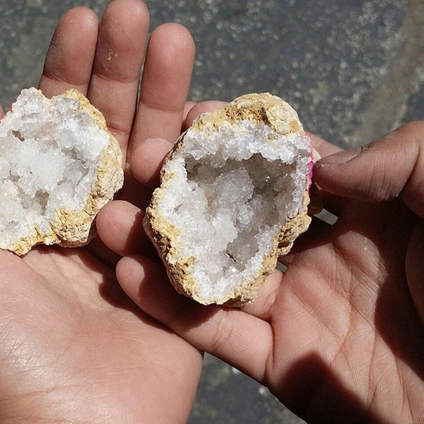 Our geodes are sourced direct from geode caves, deep underground. They come from many destinations throughout the world. Since there are numerous minerals that could've accumulated within the geode, one can't always be certain what type of mineral(s) will be revealed until the moment shell exterior is ruptured. It's always a surprise as no two are ever alike!