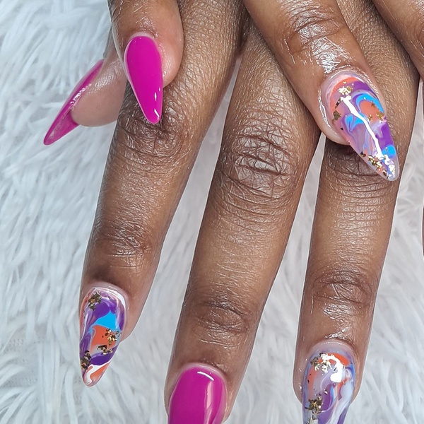 Deluxe Acrylic Fullset: short - medium nail Acrylic extension,shaped to your choice, completed with gel polish color of your choice , including 1 accent finger per hand (matte, sticker, ice or foil designs)