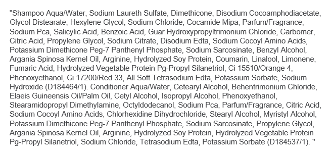 - Ingredients: "Aqua/Water/Eau, Sodium Laureth Sulfate, Coco-Betaine, Glycol Distearate, Cocamide Mipa, Sodium Lauryl Sulfate, Parfum/Fragrance, Amodimethicone, Sodium Chloride, Sodium Benzoate, Polyquaternium-7, Polyquaternium-10, Peg-40 Hydrogenated Castor Oil, CI 60730/Acid Violet 43, Salicylic Acid, Carbomer, BHT, Trideceth-6, Linalool, Arginine, Glutamic Acid, Serine, Hydroxypropyltrimonium Hydrolyzed Wheat Protein, Cetrimonium Chloride, Coumarin, Sodium Acetate, Isopropyl Alcohol, Phenoxyethanol, Sodium Hydroxide, Citric Acid. "