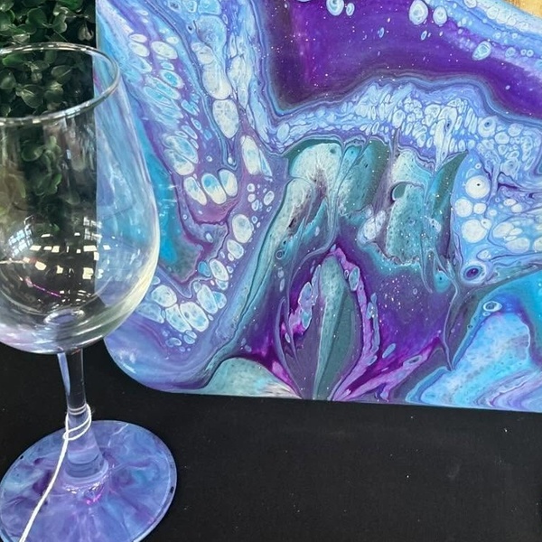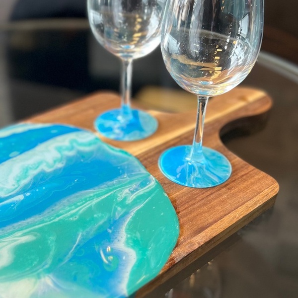 During your session, you will get to create a personalized 11x5 charcuterie board and a matching wine glass, both designed by your own hands using fluid art techniques.