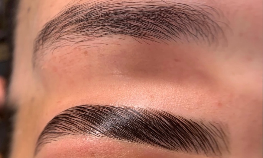 Precise waxing is performed to clean up stray hairs and perfectly shape the brow line, ensuring a clean and polished finish.