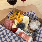 Each box is beautifully packed with a selection of delicious cheese, fruit, meat, and crackers, and can be enjoyed on its own. There is an optional wine by the glass to be purchased separately.
