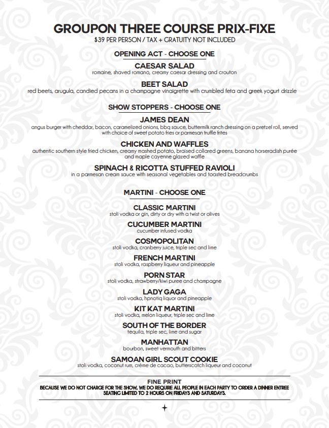 Performances begin every 30 minutes. Check out this video preview of the venue, food, and diva performances.