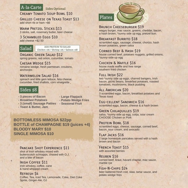 Indulge in all-you-can-eat pancakes and bottomless mimosas in the warm, welcoming atmosphere of an Irish pub.
